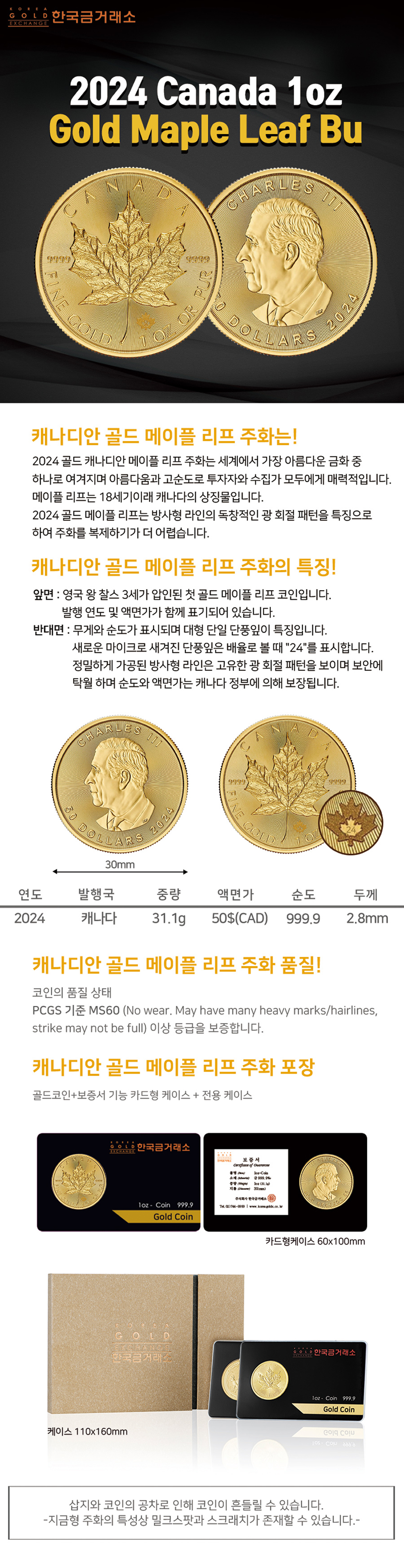 2024 1온스 골드 메이플 리프 불리온 주화(Coin) 50$(CAD)
